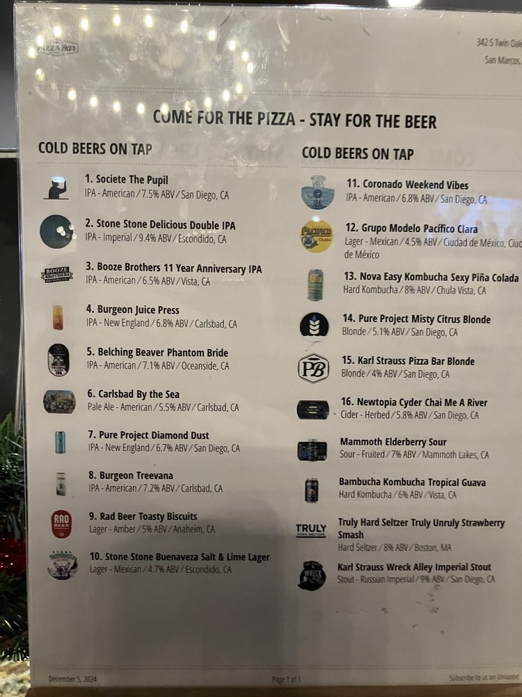 Welcome to Pizza Bar San Marcos, a delightful addition to San Marcos, CA, where pizza enthusiasts can find a perfect slice in a vibrant atmosphere. Strategically located at 342 S Twin Oaks Valley Rd #143, Pizza Bar offers both whole pies and pizza by the slice, catering to all appetites. Their menu features a tempting selection, including a 12" Cauliflower pizza for the health-conscious, and an array of classic 18" pizzas like Hawaiian, Buffalo Chicken, and Meatball Pie.